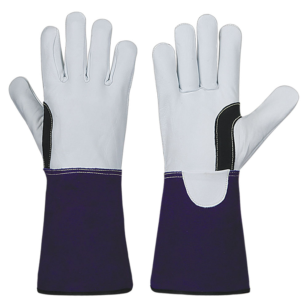 Welder’s glove, Palm & top made of natural goatskin leather, Wing thumb, reinforcement round thumb with black cow split leather, Blue cow split leather cuff 14 cm with black piping on edge.