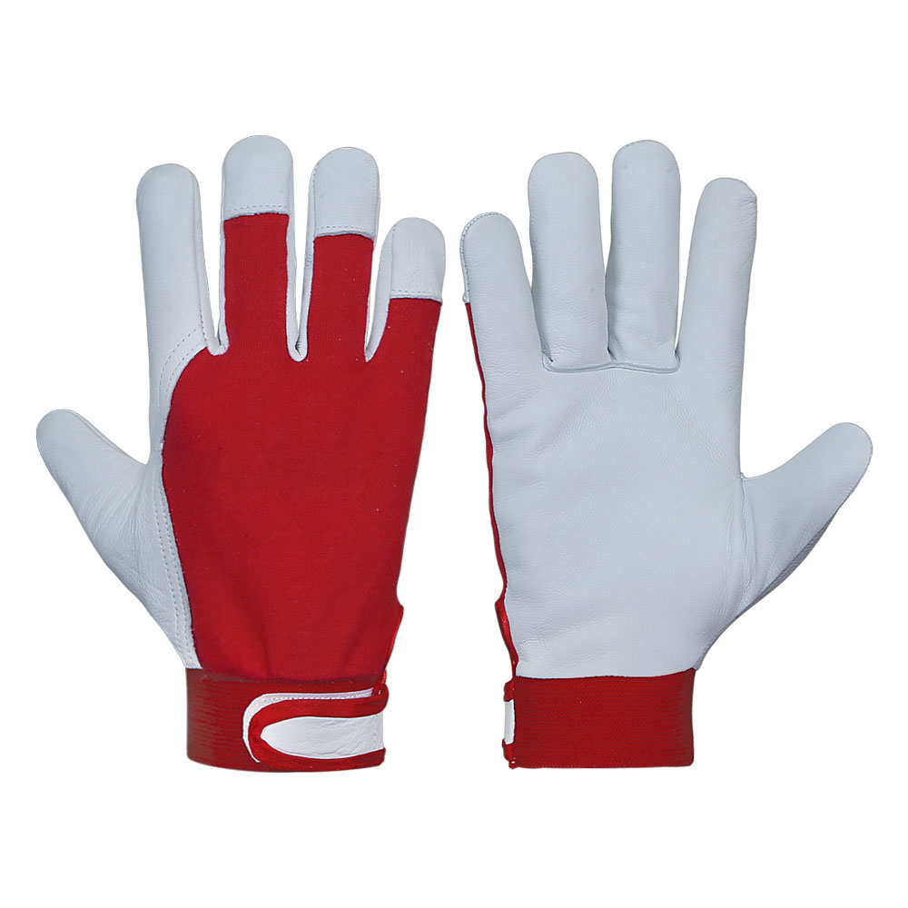 Assembly gloves, Palm made of goatskin leather back Red interlock, Wing thumb, 3 finger tips on back, and elastic Red cuff with Velcro closure.