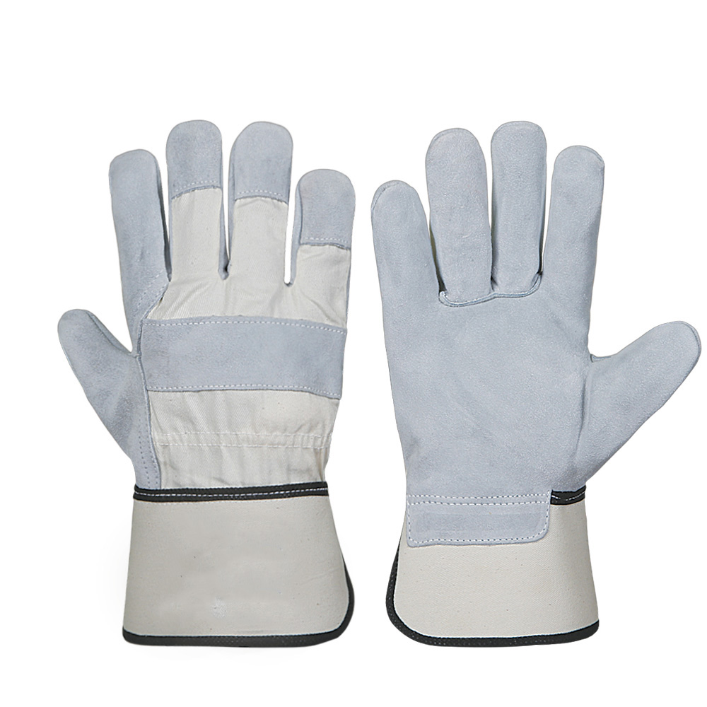 Canadian Rigger glove, Palm made of natural cow split leather back white cotton, 3 finger tips and knucSRe strap, rubberized cuff with black piping on both sides of cuff.