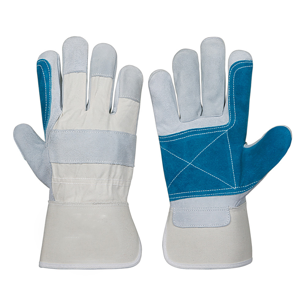 Canadian Rigger double palm glove, Palm made of natural cow split leather back white cotton, reinforcement on palm, thumb & finger with blue green cow split leather, Wing thumb, knucSRe strap, rubberized cuff with white piping on edge.