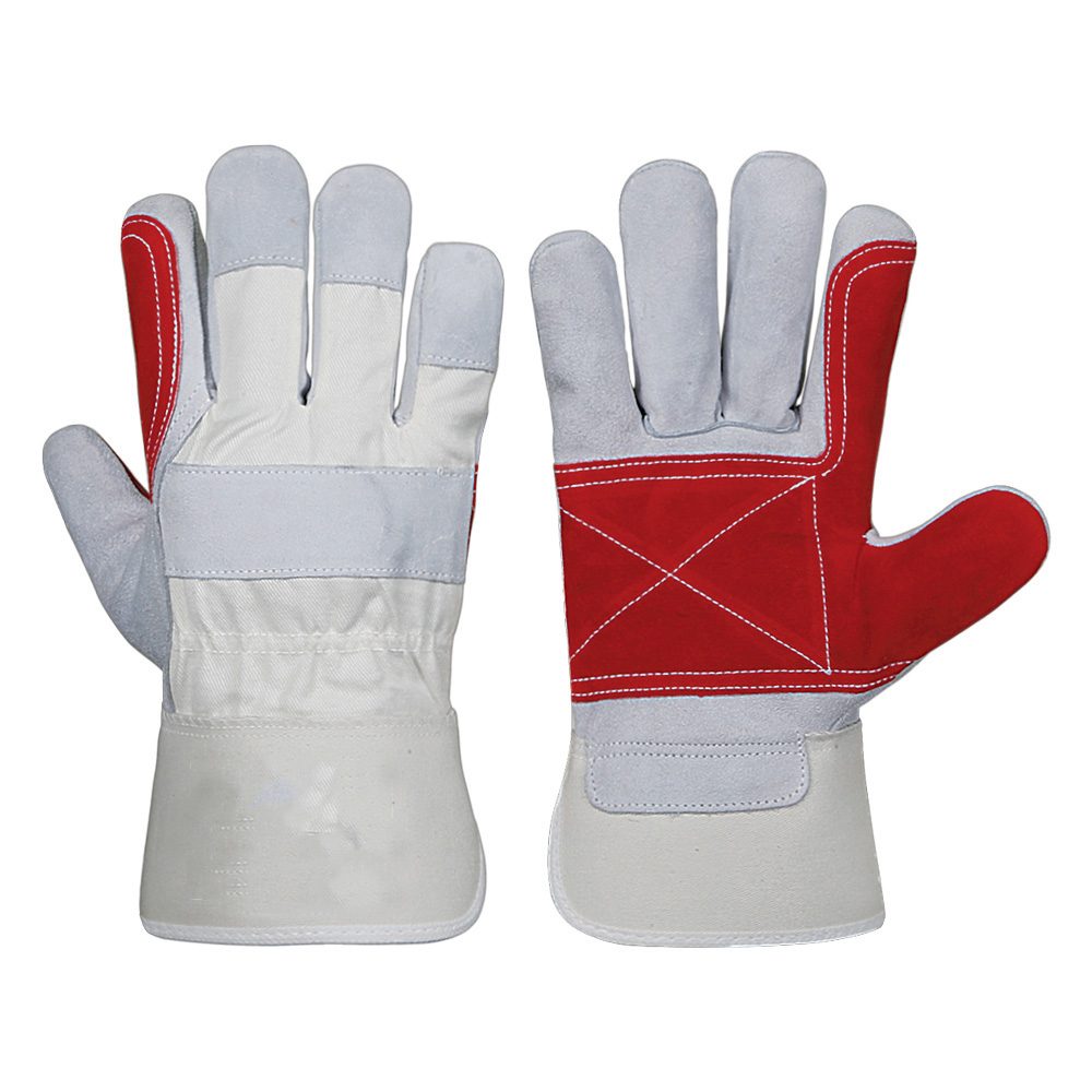 Gloves Canadian Rigger double palm glove, Palm made of natural cow split leather back white cotton, reinforcement on palm, thumb & finger with red cow split leather, Wing thumb, knucSRe strap, rubberized cuff with white piping on edge.