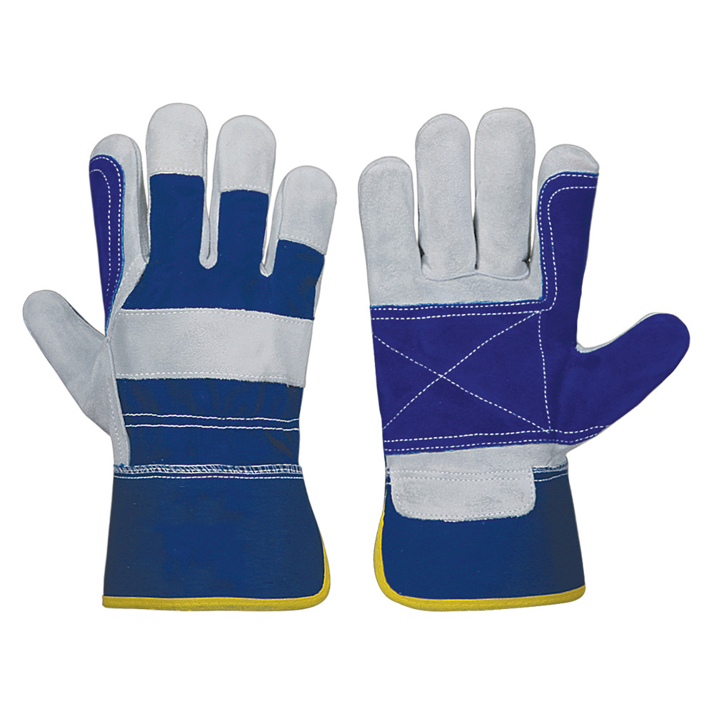Gloves Canadian Rigger double palm glove, Palm made of natural cow split leather back blue cotton, reinforcement on palm, thumb & finger with blue cow split leather, Wing thumb, knucSRe strap, rubberized cuff with yellow piping on edge.