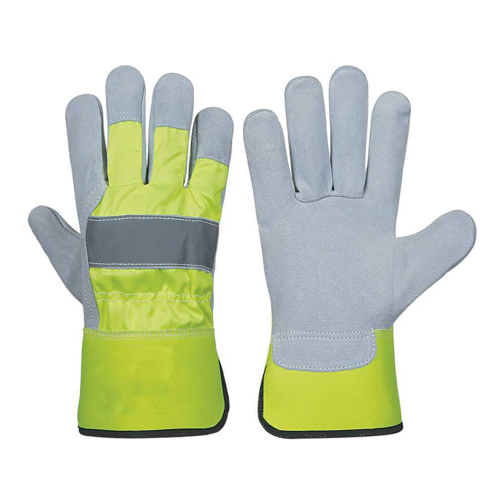 Hi-Visible Reflective glove, Palm made of natural cow split leather back fl rescent fabric, uo Inside Half fleece Lining, 3 finger tips, knucSRe strap with reflective tape, black piping on edge.